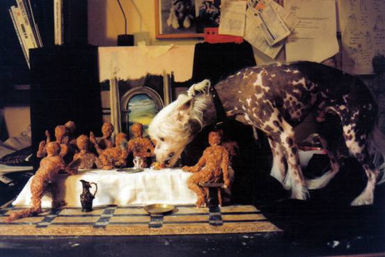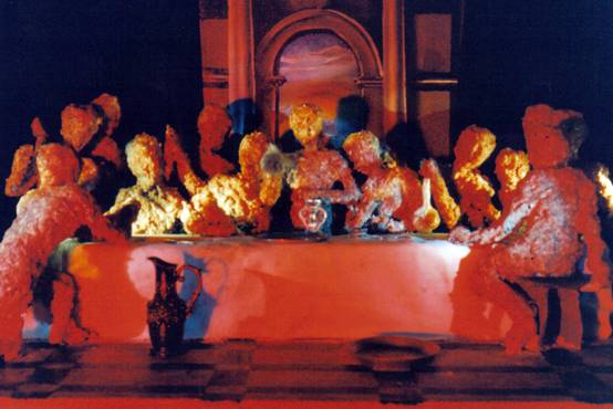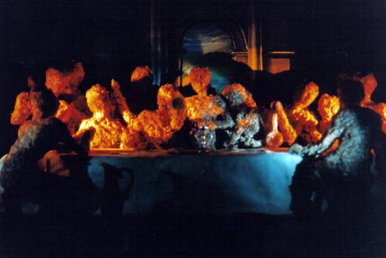 In looking at the work, you will notice a number of important design elements that contribute to the hypocritical feeling I had towards my experience of religion during this relationship. In the background of the image, you will notice a shadow that falls on the backdrop. This shadow falls across the window which allows you to find flaw in the setting. If it was in actual fact a true window, there would be no shadow at all from the figures. The main figure (intended to be Jesus) is actually holding up a piece of fluff I found under the couch. Sarcastically he shouts; 'Look at what I offer you, be amazed at my greatness, for this is what I have to offer'. The representation of this figure also represents my lack of faith regarding religious belief. I have deliberately made Jesus out of the same materials as his disciples, and dare we say to Mary Magdalene, as he in my life is no more or less important than his disciples. There is definitely a deliberate use of humour in the work. Often in visits to my partner's home I would wish his family would just lighten up, have a laugh and just chill out. When visiting his family I would spend hours on the toilet or just sitting in the bathroom pretending to go so I could just breathe freely. This family's rigidity was stifling. At the dinner table I would fantasise about standing up and saying or doing something crazy just to get an animated response, an emotion, anything. In the work this desire for humour is described in Jesus' holding of the piece of fluff. My desire to gain some sort of control over this notion of religion, is evident in the modelling of the figures. I made them, I could also destroy them, and as for my faith; well there is no other God besides me. This sense of control is transcribed in the use of objects in the scene. The vase in the foreground is a salt and pepper shaker, to big for these figures to use. The domination of these figures is also felt in the application of silverware on the table which are actually Babi doll implements from a toy store. Thus we reach the realisation of the feminine elements within the work. A scene created by me not unlike that which I could have made as a girl playing with her dollhouse. As a woman am I trying to establish the same sort of control over my current environment? There is no simple explanation to this work, or to any of my other works post 1996. The more I spend time with my work, the more I see and realise I have responded to. As an artist, it is difficult to interpret all you see within your work. Maturity as an artist and as an individual provides me with new links everyday. I am just as excited to view my works at a later stage, for they always tell me something new. Sometimes I don't know what specific works are really about until much later on. What I do know as an artist is that these works simply have to be made for me to go on. This work was eventually used on the cover of a poetry magazine put out by the Tafe. I also did an image for the back cover in which my dog consumed the sculpture. The words underneath this image stated; 'The Lord provide us'. This second image shared the same sense of humour as the first, yet took a step further to describe the nature of mass consumption and the changing value systems in contemporary society. |